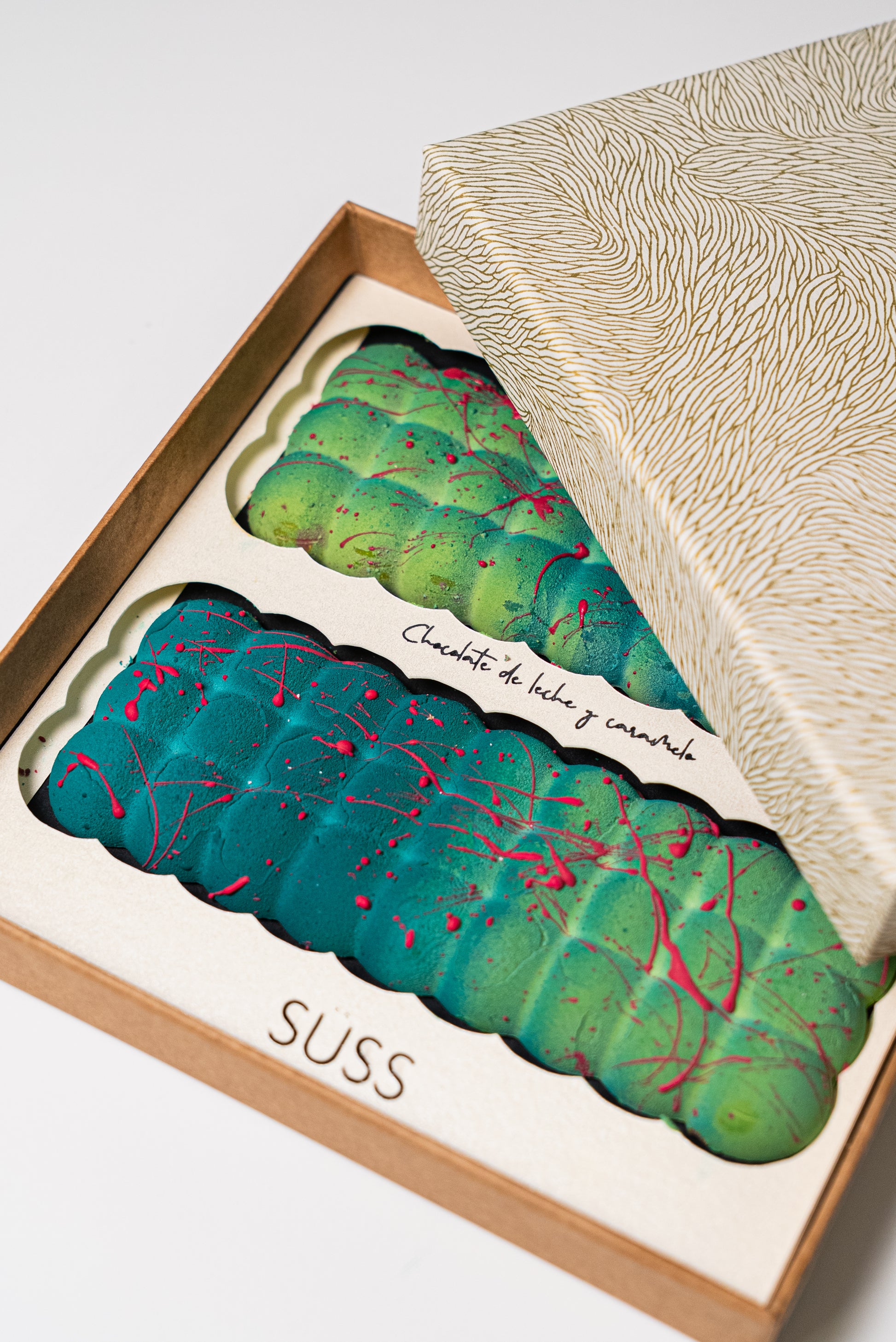 Caja de 2 tabletas de chocolate de leche rellenas de caramelo.