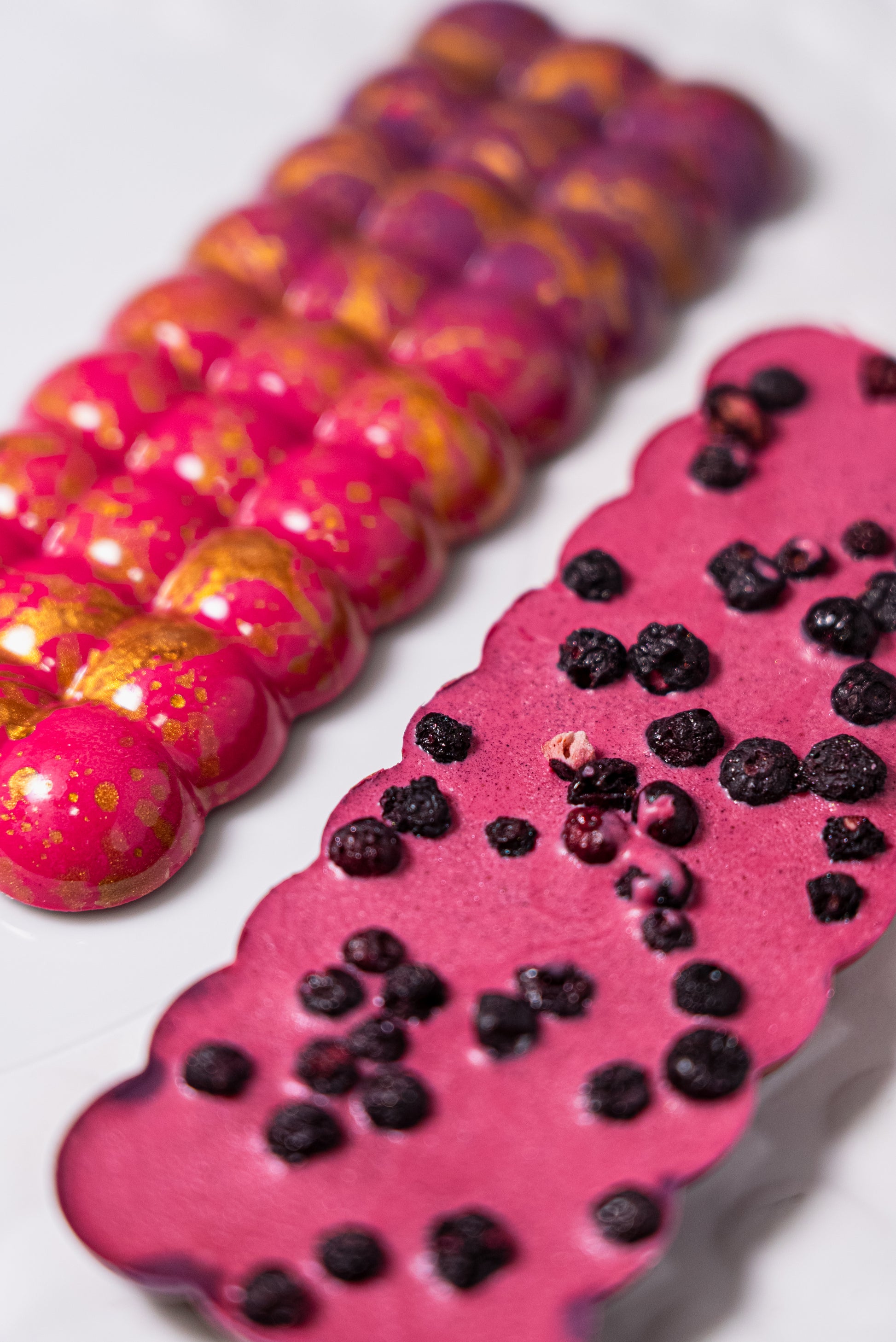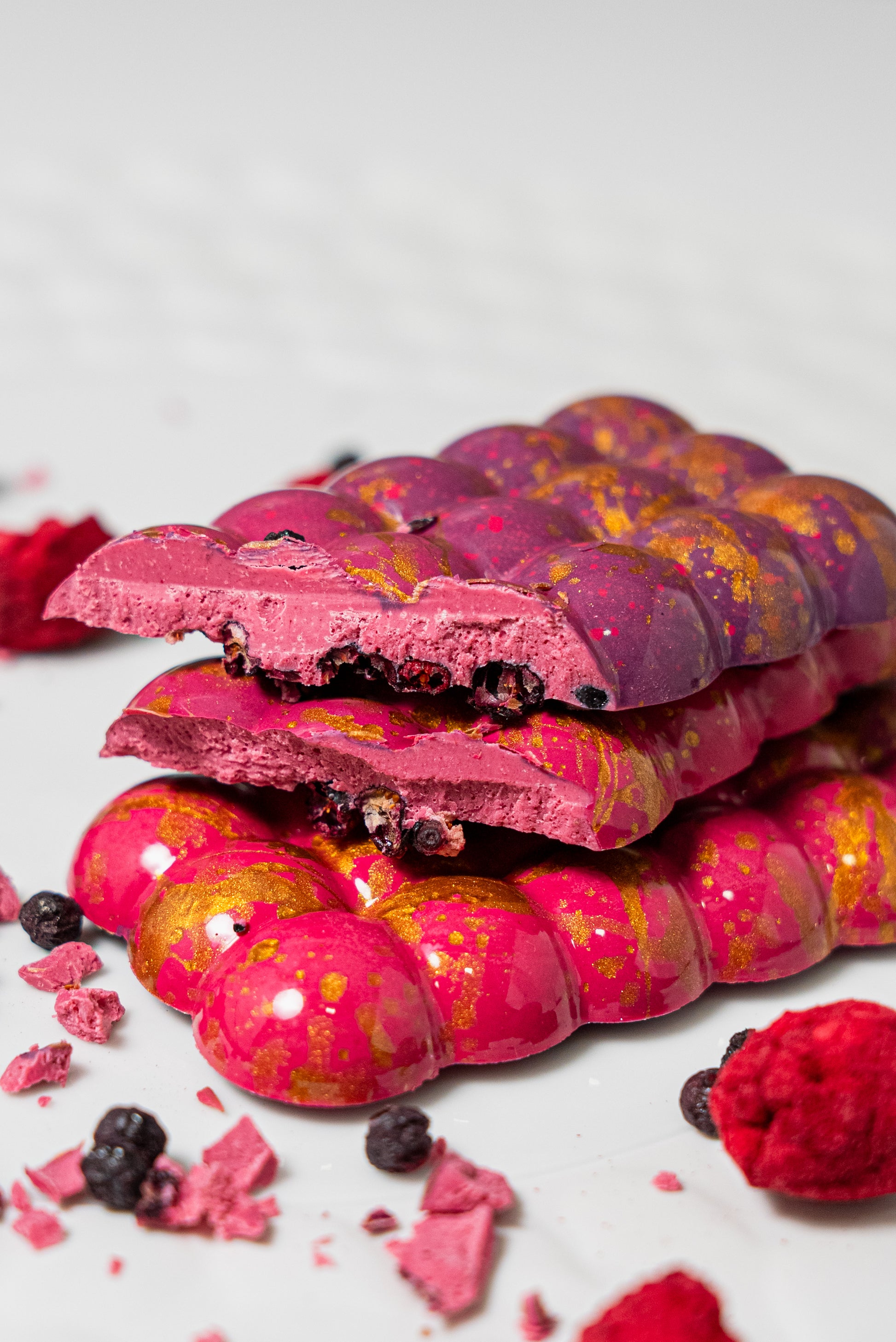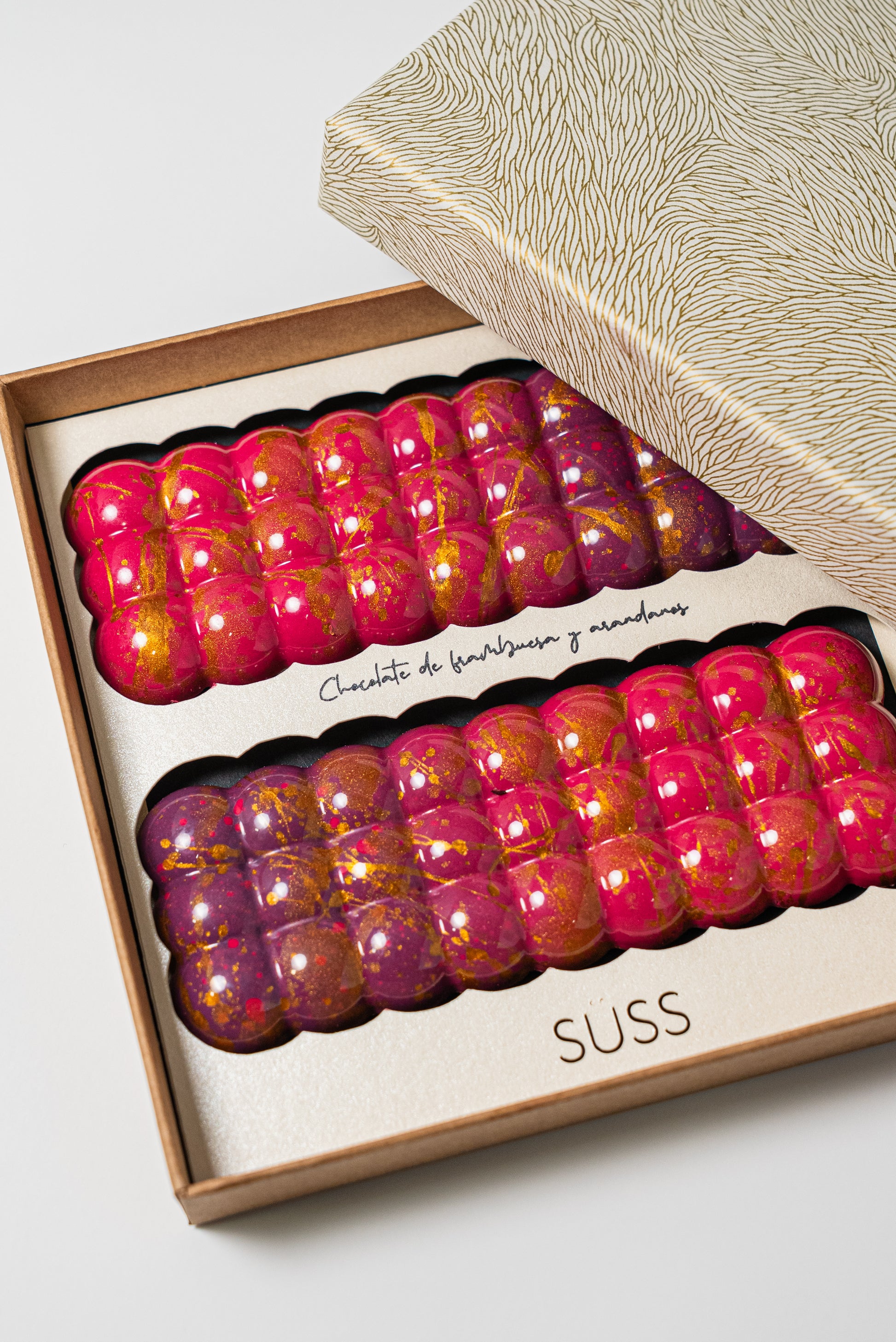 Caja de 2 tabletas de chocolate de frambuesa y arándanos liofilizados.