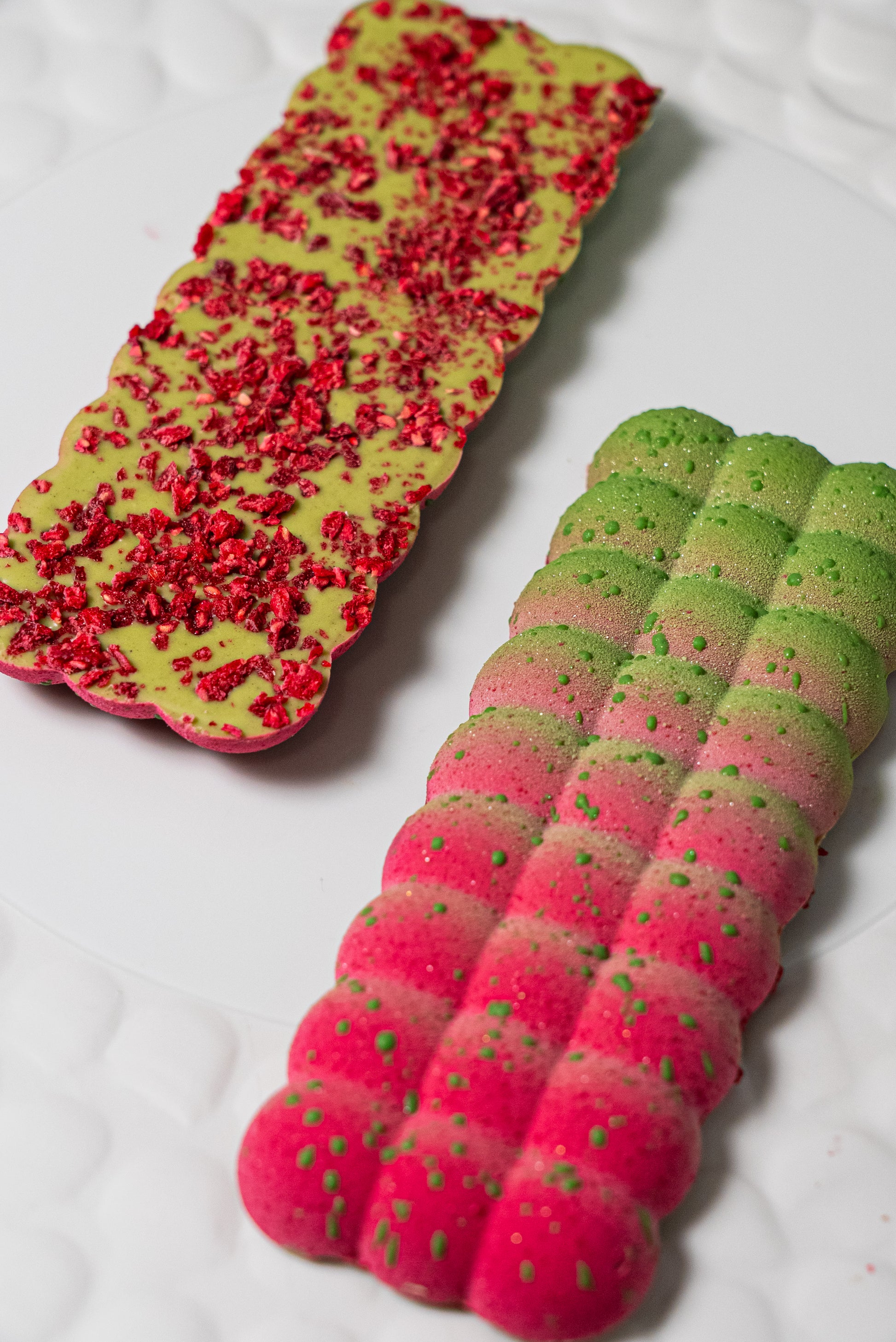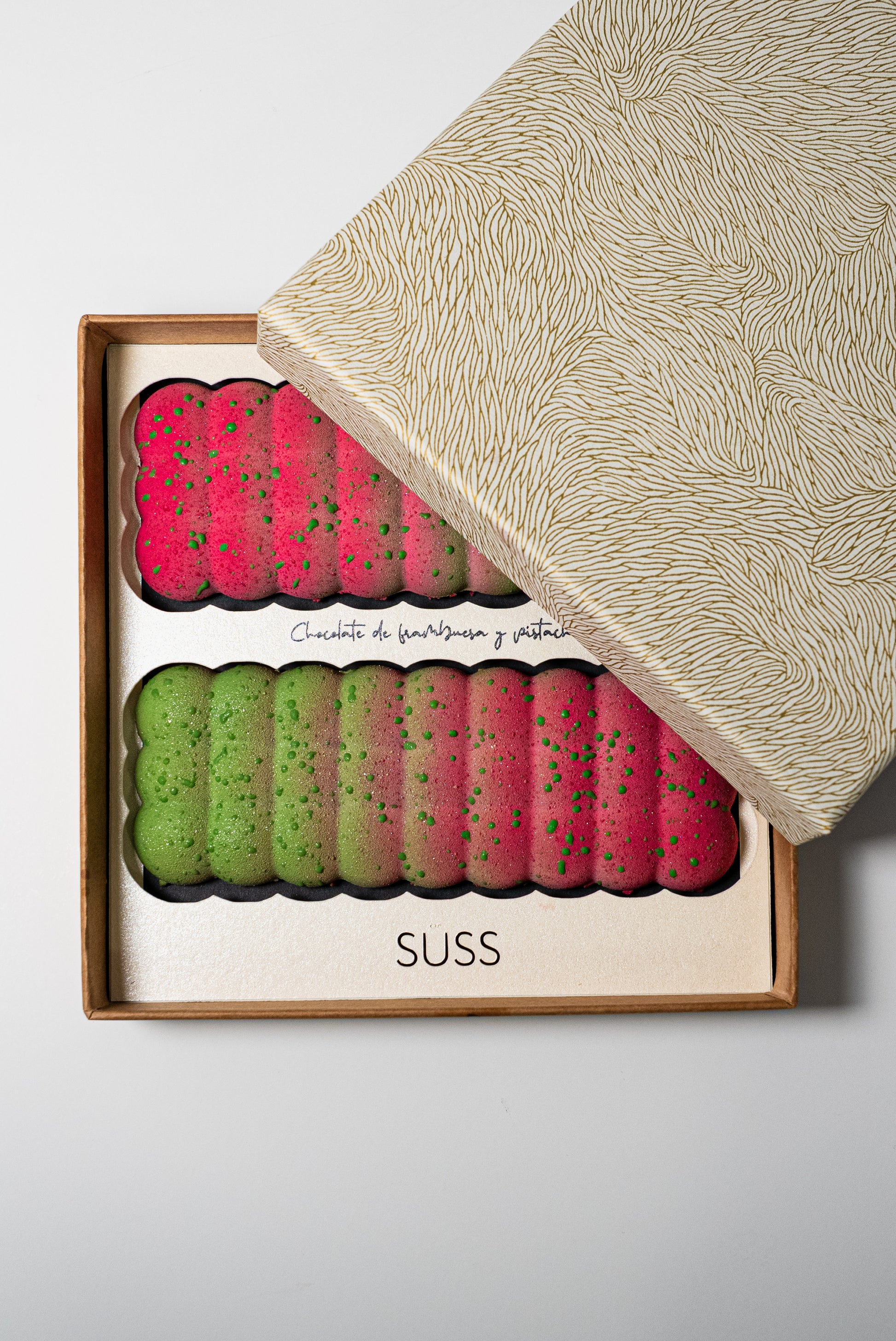Caja de 2 tabletas de chocolate de pistacho y chocolate de frambuesa con frambuesa liofilizada.